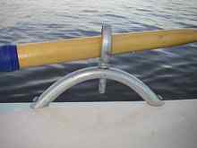 Raised oarlocks both for clearance and so I can row with the mast on the deck. Also provides a convenient handle for the boat. The white duct tape is to keep water out of the previous oarlock holes.