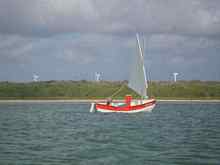 Gamaray had both reefs in by this time and they stayed in for the remainder of the trip. Even with both reefs in, our speed averaged 5 to 6 knots. There were times when the wind would kick up even higher and at those times we would hit 7 knots for a few minutes. The highest speeds we saw were on the 5th and 6th days when we averaged 6 or 7 knots, and hit 8 a few times. I think the boat was starting to lighten up a bit as water and food supplies were consumed. In a boat with a 12 foot waterline these speeds are plenty fast as far as I am concerned (course my main cruising boat is a Potter 19 so it’s not like I am used to going fast to begin with). Another thing-if you are singlehanding on this trip you really have to pace yourself. We were on the water 8 to 10 hours a day and taking a break meant pulling over and anchoring (in mostly rough water) or beaching the boat. In these winds, trying to squeeze out every bit of performance is hard on the boat and on the sailor, too, and sailing the boat on the edge all day takes a somewhat difficult, fun adventure and turns it into an ordeal for the singlehander. You want to take it easy if you are singlehanding, in my opinion anyway.