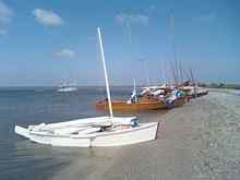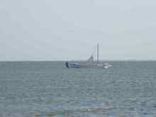 The ride across the Bay was rough and at times a bit tense, so after threading Stingray Hole and turning east into the Ship Channel I wanted a break and the chance to have something for lunch that didn’t start with Clif and end with Bar. One of the great things about the Mayfly is that the weighted rudderblade and the auto release camcleat on the leeboard allow the boat to take care of itself when beaching. I can find a beach and sail up to it and not worry about a thing but steering and working the sheet. Point of Mustang on the south side of the channel had a beach that looked like it fit the bill, so I headed over for a quick lunch and the opportunity to stretch my legs. I saw Ozey Pearl pass and within about 5 minutes of my arrival, a large catamaran (30’ ?) with some sunbathers in bikinis whose crew had seen me sail up to the beach tried the same trick and grounded hard about a hundred yards out. I had some pretty good entertainment for the first 15 minutes of my lunch, although the language I could hear would not have passed muster on TV anywhere but HBO.