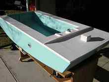 After applying a coat of latex primer, and three coats of latex deck and floor paint to the bottom and sides of the hull, I turned the boat upright so I could work on it's topside.