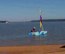 Duck Bill being readied to sail off the beach, Lake Eufaula, Sail Oklahoma - Photo by Allen Hamm |