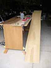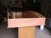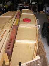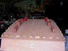 Hull bottom panel attached. Shows the bottom plywood screwed down while the adhesive is curing. |