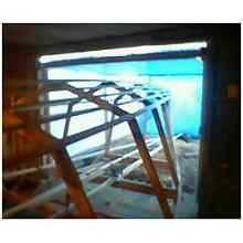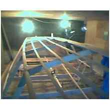 Most of the timber I had purchased for the keelson and stringers came in 5 meter or 4 meter lengths so I had to scarf it to full length before I could fit the Keelson in for laminating. This was achieved by checking the frames out to house it flush when faired off then laminated in place. They were removed again and dressed and fitted to the straight stem post. The chines were constructed in the same manner. The stringers were scarfed to full length and fitted as well. Next, I faired the framework with a hand plane ready for the fitting of the sheets of plywood. I started fitting the plywood on the bottom from keel line to chine scarfing each joint and fitting a back plate as well between all stringers and chines and keelson. The bow would have to be planked in from approximately 1.2 meters back from the bow and this was achieved in 150mm strips at a 30 degree angle from the centreline. The main 9mm sheet had to be rebated 40mm to begin facilitating this so the planking would be staggered and the butt were joins far enough apart so as to not compromise strength. Fitting the side's panels was the same process but no planking in the bow.