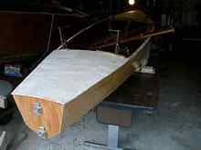 And with that my story is just about caught up to the present. One nasty task was to cut the whole in the foredeck for the mast to pass through to the mast step below, but very carefully I got that done so that the mast, when stepped, was sufficiently straight and in proper position.