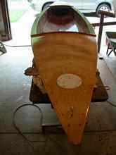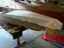 I finished cutting the cockpit trim pieces to fit, rounded and sanded the edges, and glued them onto the hull, giving them a coat of epoxy at the same time. After shaping the edges of the deck plywood flush to the sides (carefully-don't want to damage the finish on the sides and transom) and removing the screws, I installed rubrail (pine half-round molding) and put a coat of epoxy on, filled the screw holes, sanded, and it was once more fiberglass time. I put some masking around to protect the finish on the hull.