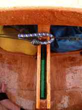 The second morning I launched the kayak (the "trailer" worked beautifully, getting it down a rocky beach for a solo launch, and retrieval). The trailer is shown in Figure 37, but I'll describe it here: ¼" threaded steel rod, with copper sleeve between the eyes, two more sleeves that go under lawnmower wheels, with PVC spacers to keep the wheels from rubbing on the rubrail Paddling out onto Lake Ontario was a wonderful experience. Deb and I paddled it together (two paddles by now), and had a great time, though we were stopped by the U. S. coastguard, and had to return to shore for proper life jackets (in Canada, my boat didn't need registration, which I didn't yet have, but the cushion flotation didn't pass muster for Canadian rules, and so we failed to comply either way with the Bureau of Compliance). I had rigged a tiller locking mechanism, two thin cords routed through screw eyes under the cockpit sides, with a loop over the tiller. I've tweaked it since, but with the rudder partially down and locked, the boat tracked beautifully. Here's a shot down the daggerboard trunk with nothing but deep clear water underneath!