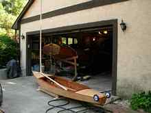 It's a Sailboat At this point, I had a wonderful kayak, but not yet a sailboat. I was waiting for the sail from Duckworks, but as usual got impatient and decided to make the mast and boom anyway. As I said, I had some serious doubts as to whether it would turn out to be a manageable sailboat, so although I'd scoped some clear pine boards that were quite pricey, I went and sifted through 12' 2x6s at a local lumber store, and found one that was remarkably clear, though with a bit of a warp. I figured I could live with warp in one dimension, especially for these "trial" spars, so ripped it into 1.5" pieces, cut to shape, rounded with a router and finished rounding by lots of muscle.