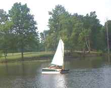 John takes his completed John Duck for a sail on Lake Vista. John was a state cop and ex-military, so he built his boat like a tank and chose a lug sail to power it. |