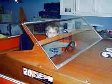 Hot Tub #5 was the 4’ x 8’ version of a racing Chris Craft. Built from good luaun, she had an inner shell of Styrofoam, go-cart steering components, and a swiveling adjustable plastic seat. |