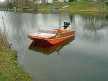 #4 got a workout at a Michigan messabout from a tunnel hull builder who tried her with a couple of his engines. With a 5 hp she could get up on a plane and really fly. |