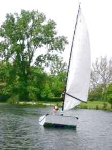She looks pretty impressive with the 5 hp Briggs hanging off the transom, but I never did test her with that engine. Read more about this little scow here: https://www.polysail.com/4x8boat.htm |