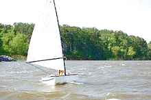 Lame Duck handles some rough water at the Midwest Messabout at Rend Lake, Illinois. Lame Duck was the sixth 4’ x 8’ scow I built. |
