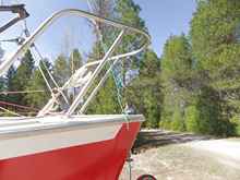 So, to make an extremely convoluted evolution less mobius, I have settled on a wishbone arrangement that will (hopefully) stow on the deck and stay ready for action. Of course, if it's too much of a trip hazard, or to clear the foc'sl for parade, the wishbone is pretty easy to remove. More complex to stow than the previous single-pole contraptions. This particular wishbone is still on probation. I was fortunate to be in a thrift store that specializes in things like household windows and junk furnaces one day. They had scads and scads of windsurfer booms in a pile. When I asked about them, the nice lady behind the counter said something like, "You want those poles? Take 'em." And now I have a whole collection of spares. No windsurfer. But, lots and lots of wishbone booms. So, there's room for adding and subtracting length. Simplicating.