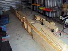 My first dilemma was where to build the boat. I have a big shop here at work, but didn't want the distraction of having it here and also potentially having it get in the way over time. I secured a space near my house so it will double as storage and a shop. One issue with building a 24' long strongback is the space it takes up when not being used. I decided to make it so that it breaks down if desired for storing. I built the strongback at work since I had more room and it would be a good test of how well it breaks down. It came apart easily after completion and transported in the back of a truck with no problems. The reassembly went quickly too.