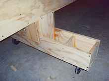 At this point the main legs barely overlapped the main beam which is all that was needed. They were screwed on to make sure they stayed in place, but they aren’t tight. I predrilled holes in the legs that were larger than the screws. This allowed the beam to “float” within the two legs so that all four wheels would always be touching the floor and not rock when moved around the floor. I’ve had too much experience with uneven shop floors over the years.