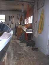 P48 shows me standing with the two finished 16' oar: a coat of varnish diluted 1/2 with turps, primer, and two coats of enamel. No epoxy sealing in this case. |