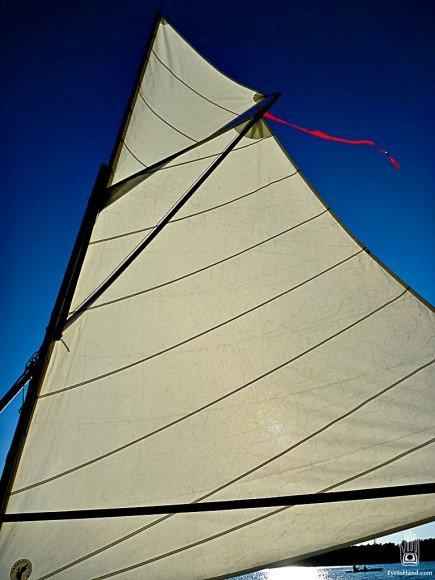 Barry Long has a topsail for his little 13 foot melonseeds but this is the best he can do showing them to us. I want to know how he gets them up and how they work. He claims that he's so fast that no one can keep up with him to take a picture.