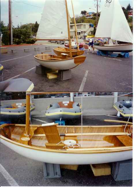 The bottom is rounder than it should be for best stability, though it's still a dandy little, sailer/rower. Been garaged, covered, and rests on a special little two wheeled sailing dolly that supports the boat in a sling type fashion. Passing it on to son and his family as they have moved close to a Lake. There are two pictures together/top to bottom.