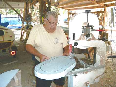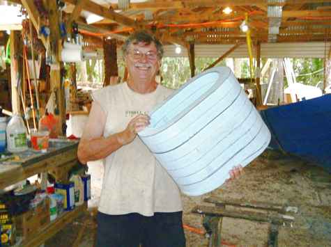 You can see from the pictures that we've switched to our summer uniforms here at the shop. First is me holding my smoke stack, Yep a smoke stack. You know that I'm putting everything including the kitchen sink in Helen Marie. Howard came down to the hut yesterday all excited because he'd thought of something I was missing that was absolutely essential. The longer we sat around discussing the merits of a stack the better it sounded. Some of the uses could be; a water tank to warm up shower water or a small garden plot or a place to put my family crest but the best was to put a smoke machine inside and even better a bubble machine like Lawrence Welk. I'll glass it all up and stick it on once we're out of the shop. Neat huh?