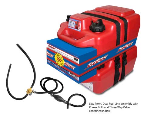 - Two Patented SecureStack® 6-gallon Plastic O/B Gas Tanks, Low Perm, EPA-Approved with Connector, Hose Kit and Straps