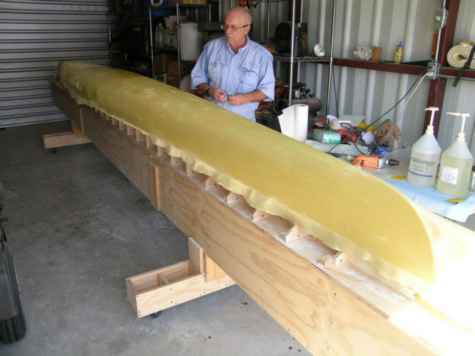 Here is a pic from this weekend with the Guru himself. Skip Johnson was nice enough to help me. This pic is with the Kevlar on. We later had fiberglass and peelply on it. Do you see the epoxy from Duckworks in the background?