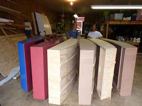 Here are the six newest hulls out of Indiana PA. The two finished ones are Ean Villemain's Eagle Scout project. Two of the others are a sailing club project at the local university. We launched six PDRs in Indiana last year. All told, John Bridges (in photo with G Smith, owner of the "boat shop") has helped get at least 40 or more built.