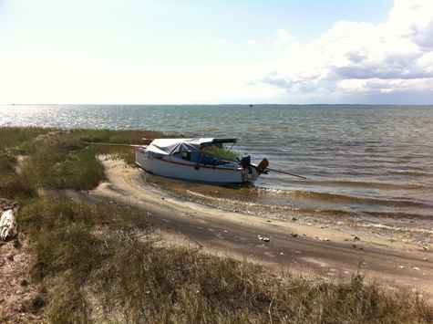 I just came back from a fantastic week in the Core Sound of the North Carolina outer banks with my wife in our AF3, Cream Cheese. In preparation, I did a number of upgrades that worked out really well; cuddy floorboards, cockpit thwarts, new mainsheet arrangement. outboard motor mount (reluctantly) and spar rails for storing oars, mast and boom on the cabin top. We had some great weather but also some thunderstorms, strong winds and even had to shoo off late night raccoons from the cockpit. One day, we slogged upwind for four hours in 20 to 30 mph winds (double reefed) and Cream Cheese surprised me with how well she handled it.