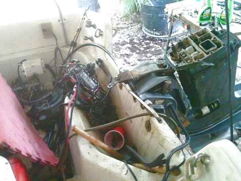 Never a dull moment around here and if things slow down someone will break something. As Crazy Steve says, "your tragedy is our entertainment" especially if it's something impossible to fix; we thrive on the impossible (as long as Howard's around). We have Phil and Howard working on an outboard motor. Phil got this great deal on a boat and motor and naturally the motor self destructed after the first half hour. Something got really hot inside and things were melted beyond all comprehension.