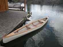This is my first skin-on-frame (SOF) kayak. I used free plans from yostwerks.com. I made a commitment at the beginning of the project to build with 100% recycled, reused or re-purposed materials. Plywood came from a neighbors trash and a friends old home made checker board. Wood for the stringers came from a pile of treated lumber that I bought on clearance at Lowes to build a framework for rolling my sharpie egret. I saved the pieces. I ripped 3/4" by 3/4" pcs and scarfed them to get long knot free stringers. I did buy on tube of PL Premium for glue. The skin is 13oz vinyl scrim donated by Conestoga DPI. They generously gave me approx. 5' x 40' of excess material from their shop. I had a partial bottle of contact cement and a friend gave me the last bit in the bottom of a can he had. I painted the wood frame before stretching the skin over it with a two part water based epoxy paint complements of Lancaster Creative Reuse. They were delighted when I took nearly 25 gals of various paints off their hands! Varnish on the coaming comes from a can given me by my brother-in-law. The Greenland style paddle is redwood that I pulled from a construction site dumpster. I got two 4' 2x6s and scarfed them together to get the needed length. Thank you to all my friends for making this possible and to my family for letting me use half the garage this winter.