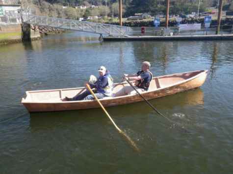 Rick Laudervale (2010 PDR World Champion and repeated Canadian PDR Champion) came down from British Columbia to attend the Depoe Bay Boat Show. I put him to work immediately. Together, plus a few friends and some strangers I pulled in off the street, we did the finishing on one of the Mollyhawks: Installing seats, inwales, the keel, etc. At 5pm, we tossed her in the water and took her for a spin.