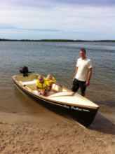 The next test was a 2hp outboard: She performed STUNNINGLY. Two passengers, one on the stern seat one on bow seat to trim her out. The pootled about for a bit, then started playing with the motor - the had the boat turning in its own length! They'd just go round and round, then slam the outboard over to the other tack, and go round and round that way.