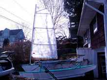 14'9", width 5'2"). The hull is mostly done. Just need to do a bunch more fiberglassing and put together the centerboard case, foils, and spars. I hope to have it done by summertime.
