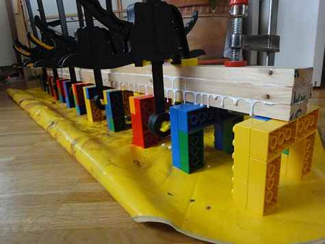 This photo shows a good use for Lego (TM) Duplo bricks for all you family people. As all those clamps have a lot of weight, I decided I wanted maximum support for laminating these 7" Michalak-type oar blanks, to prevent bending. A heap of Lego-made supports did the job nicely. Glue pops off their surface easily at the push of a fingernail.