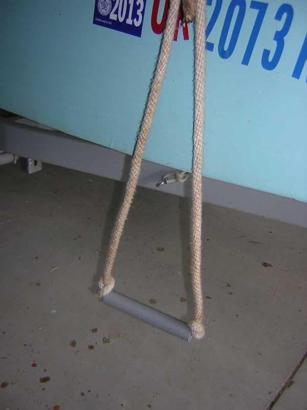 So I made a crude one-step rope boarding ladder to use should ever the need arise. I had a old piece of 3/4-inch rope about 12 feet long, and some electrical PVC cutoff pieces laying around so I used that.