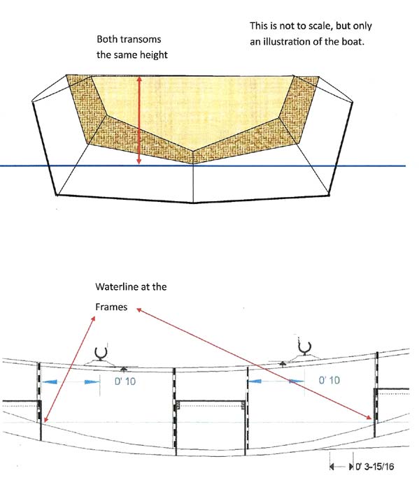 Alby has its' two transoms whose top side is the same height above the waterline. This is wonderfully convenient for measuring and it has a neat level look on the water. I think a level sheer in an 8 footer looks good. Not only that, the waterline hits the hull right at two frames, so the hull will be stiff right where the water challenges the plywood.
