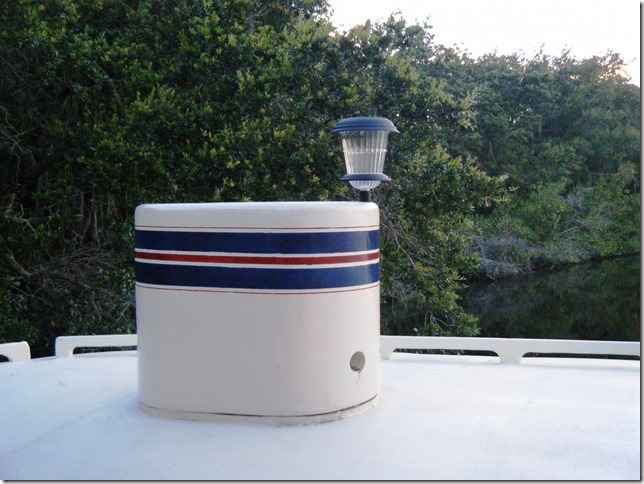 I stuck it in the back of my stack and just leave it there. It charges up all day and comes on at night weather I'm using the boat or not. It will unscrew from it's pipe if I want it off or to change it and I never have to worry about power to it. It's my running light and my anchor light all in one. Being here up top it also lights up the area around the boat but doesn't shine into the windows. I got this one for $8 at Lowes.