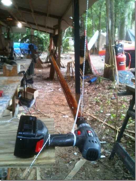 Here's how you get a hundred coats of varnish on a spar fast and easy. I can't claim credit for this, Simon showed us how to hook a drill to the end of a spar, turn it real slow and gob a whole lot of epoxy on it without having it run. I was refinishing my boom and gaff and decided to give it a try. I put a screw in one end for the drill and just looped a small line around about a foot from the jaw end. I couldn't put a screw in that end because of the wide jaws.