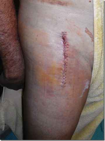 Oh come on, you knew that I had to show you a picture of my hip scar. He just opened my leg up, cut out the old worn out hip, put in a new one and sewed it back up. No muscles cut. I'm up walking around a week later with little pain and no pain meds. These staples come out in a couple more days. Speaking of hips, I've been out of the hospital less than a week and I seem to be back up to full speed. No pain or pain meds, today I even helped Howard pull the lower unit out of the big new outdrive we got for him. Imagine what they'll be able to do in a few more years.