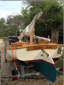 Texas Jim Rester finished his modifications of this little Marshall catboat, a sandpiper I think. He had them put on their custom tabernacle for the mast. This is the boat he stole from some little old lady, sure wish I'd known about it.