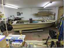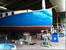 Some people take better of their boats than I do. Here's good ol Sweet Pea, the Finwick Williams 18 catboat that Judy Blue Eyes got from us. As you can see, her idea of a proper finish and mine are vastly different. I don't think it's house paint making this blue hull reflect like this. This one is getting prepped for a wooden show up there someplace.