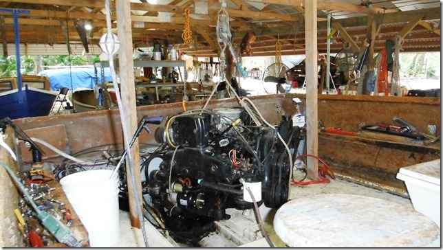 Here's the motor from that big old ugly Sea Ray hanging in the air. It took Howard about a day to break it loose, pull it up, replace the starter and all the fluids and put it back in. I'd still be standing there wondering if I should even try doing it. With Howard it's best to just stand back and out of his way.