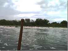 There's a fixed dam about two miles up stream from me that separates the fresh from the salt water. After all the rains we've had the river is totally fresh and the dam is about under water. Here is the water ripping over it.