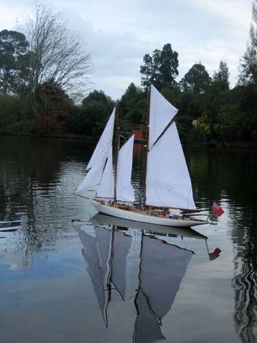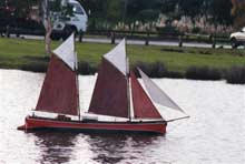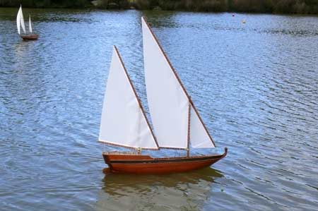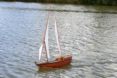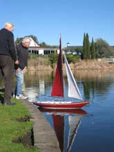 Pride of the fleet (in my books), the fleet flagship is Keith Griffin’s absolutely lovely model of the Fife schooner Altair which built over eight months from the late Sandy Cousins plans available from Marine Modelling Inernational’s Traplet Plan Service. He’s done a wonderful job indeed and produced a model that attracts attention and plaudits from passers by. Crewed with good figures, it sails really well.