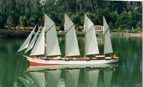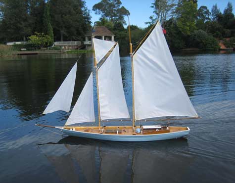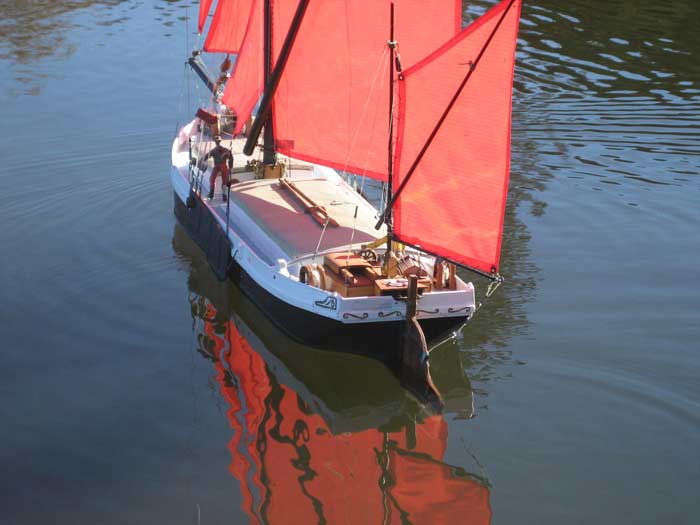 Alex Bartlett’s RC sailing dhow was built plank on plywood frames, the plans scaled up from a book and is just over a metre in hull length. The sails he made of a synthetic material purchased and the keel and bulb overall weight is approx 5 lbs.