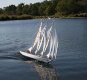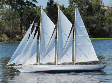 Four channel RC is fitted, one channel controls the rudder, two channels control overlapping jibs using two metal geared servos with arms. The remaining channel controls the Main sail as well as all staysails using two sail arm winches hooked up with a `Y’ harness, one winch for the upper two staysails, the other for the main sail and the other three lower staysails. Power is provided with a 1.3ah gell cell battery and the transmitter used is a Hitec Optic 6 FM digital proportional.