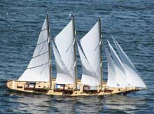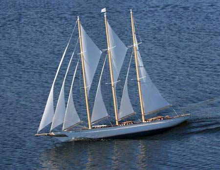His latest is a 3 masted staysail schooner called Meteor. Having always liked the 1927 built 3 masted schooner Creole, as well as the fullsize Meteor owned by daughters of Gucci,he decided to build his own version as a 3 master and call it Meteor so you could say that it really is very much his own creation. An incurable  romantic when it comes to building and sailing RC schooner models, his imagination was first fired by the John Alden schooner Borkanriff IV.