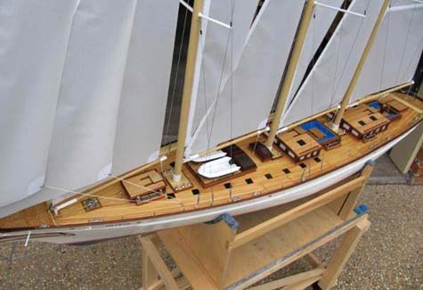 This model is one of the six that includes the Maltese Falcon (see  the writer’s column of July 2012 in Duckworks for a photo of the half built model being tested). Rick would like to follow that up with one of the Atlantic, then the Athos and the Eos, a 3 masted Bermuda-rigged  304’ schooner one of the largest in the world.’ A bit of  information on the build. The sparred length is 1,540mm, beam 290mm, the draft on the hull 140mm, the draft (including the keel) 340mm, ballast on the keel 4,250kgs, total weight of model approx 10.3kgs, the main mast above deck 1,020mm.