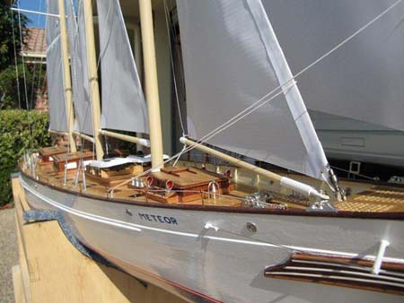 He writes:  `Seven years ago on 1st October 2005 I launched my own design model of Sea Hawk, a likeness to Borkanriff  IV  that I had seen some years before in a yachting magazine. I then obtained plans of the real yacht from John Alden’s office in Boston with the intentions of  building Meteor, the sister ship to Borkanriff.  The build however turned out a little on the heavy side and as I had always admired my Beken of Cowes photo of the 3 masted staysail schooner Creole that hangs in my garage, I decided to change the rig one model from two. The result is Meteor.