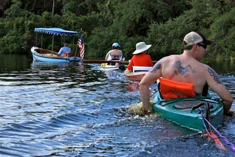 The folk in Florida dream up fun days in Tampa Bay, their latest being the `Kayak train’ where they hook up and head out sans paddles on an hour and a half, six mile long tour of the Braden River pulled by Chelsea the African Queen. Even the pooch goes along and takes in the scenery. Well done Dave Lucas of Lucas Boatworks and the Happy Hour Club. Twenty eight kayaks and canoes, a video on YouTube and a World Record!