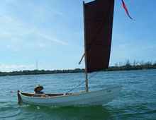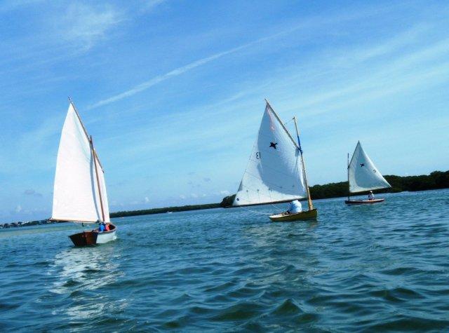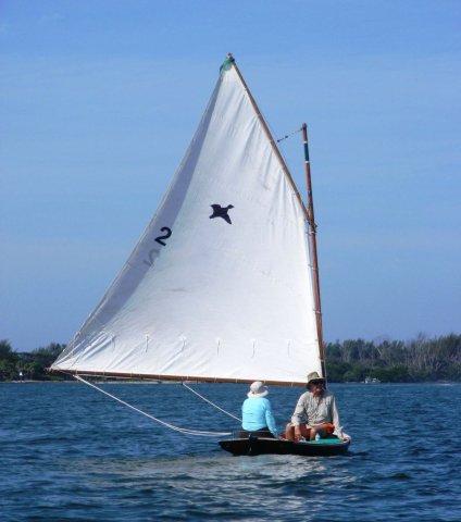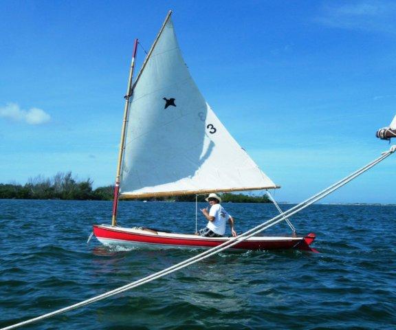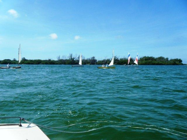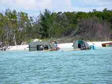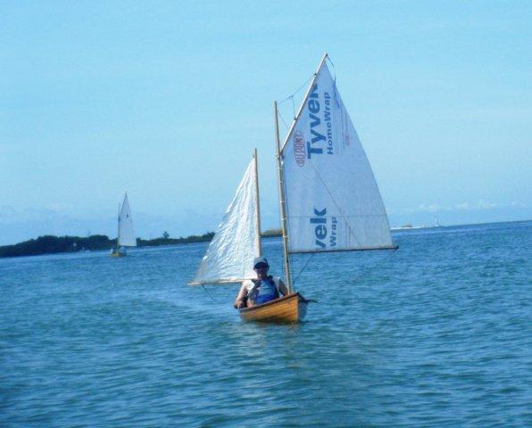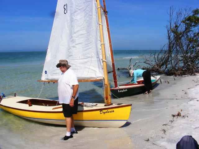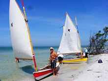 Crazy Steve had his tiny ketch wound up and moving right along. He answered the question once and for all; What's the fastest sailboat in the world for going to weather with absolutely no wind and no oars? These two melonseeds are laying on their sides to get their centerboards unstuck. The beach was not sand but crushed shell that really jammed up our boards. Since they float on their sides we just pulled them over, popped the plug on top of the cap and pushed them down with the stick made for just this.